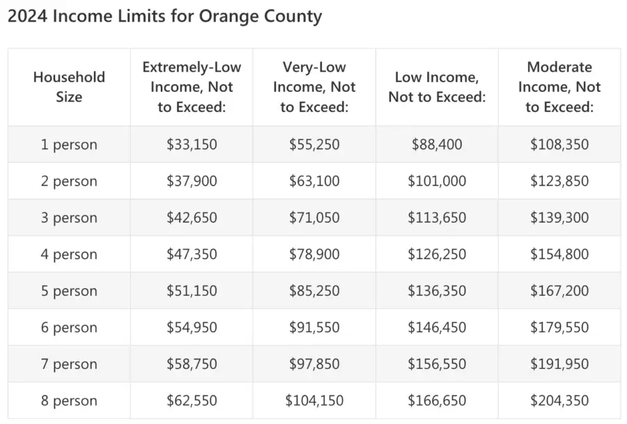 申请家庭的收入必须低于区域中位收入的50%或60%,例如在尔湾,四口之家的收入上限为$78,900。具体收入限制可以查询官网。